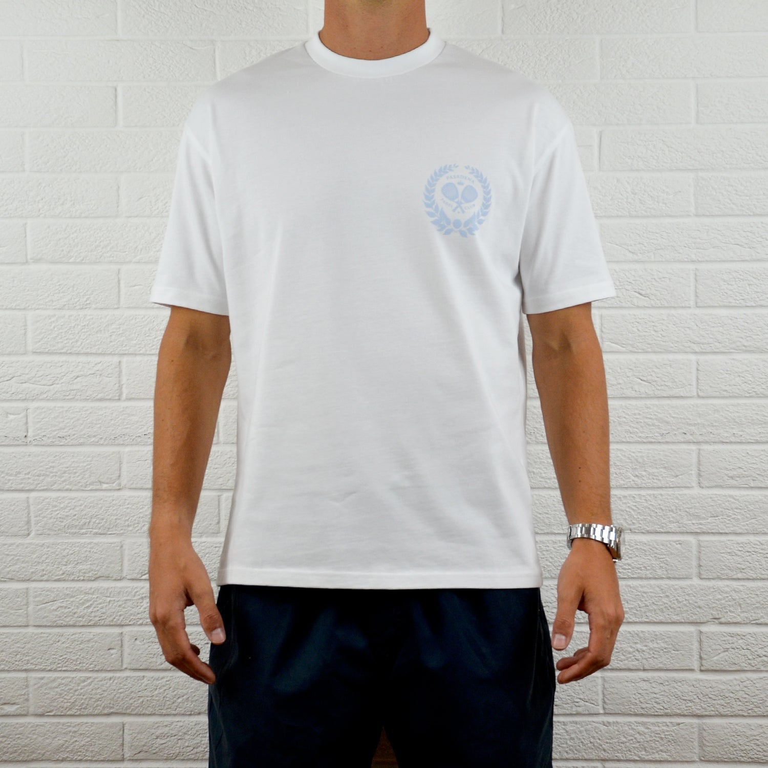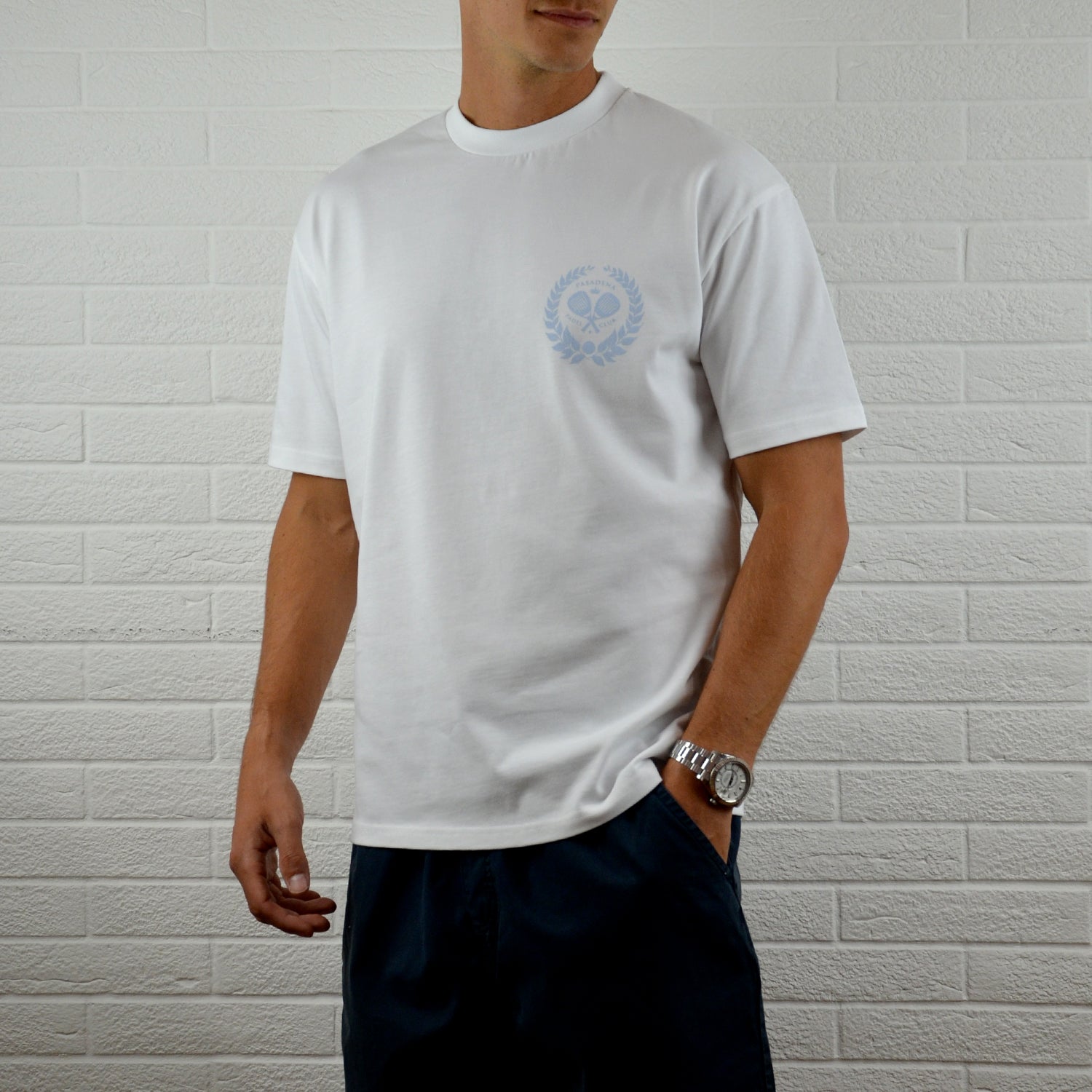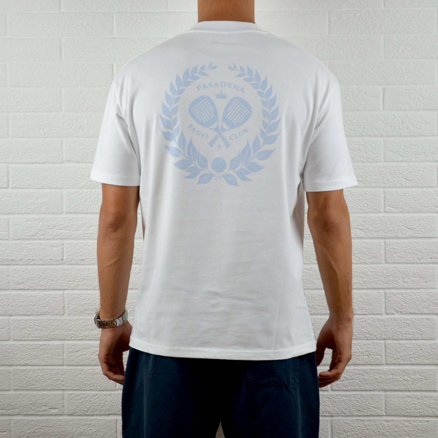 The Sky Blue Wreath Tee in white pays tribute to our heritage with the classic Pasadena Padel Club wreath design in sky blue printed on both front and back. Cut in a relaxed, oversized fit from premium cotton, it’s a bold yet timeless statement piece that blends sporting tradition with everyday style. Perfect for court sessions, club socials, or laid-back days off.
